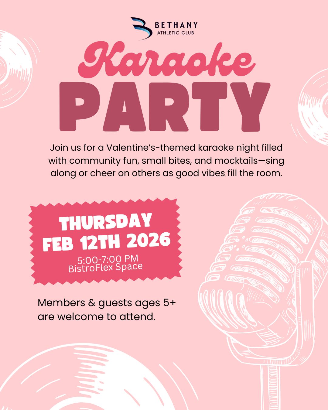 Join us for a Valentine’s-themed karaoke night filled with community fun, small bites, and mocktails—sing along or cheer on others as good vibes fill the room. Members & guests ages 5+ are welcome to attend. Date: Thursday, February 12, 2026 Time: 5:00 PM – 7:00 PM Location: BAC Bistro / Flex Space