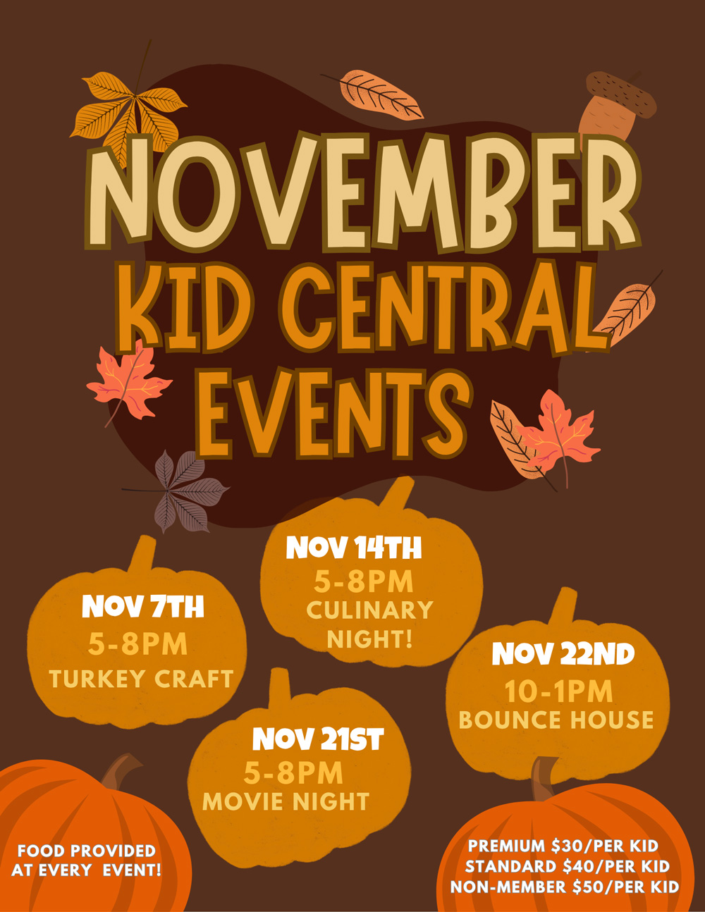 Our Kid Central Events are the perfect opportunity for adults and kids alike to have a blast! Let us entertain and feed the kids while the grown-ups get a much-needed date night or complete tasks on their to-do list. Each event has an exciting theme, nonstop healthy fun, and more!