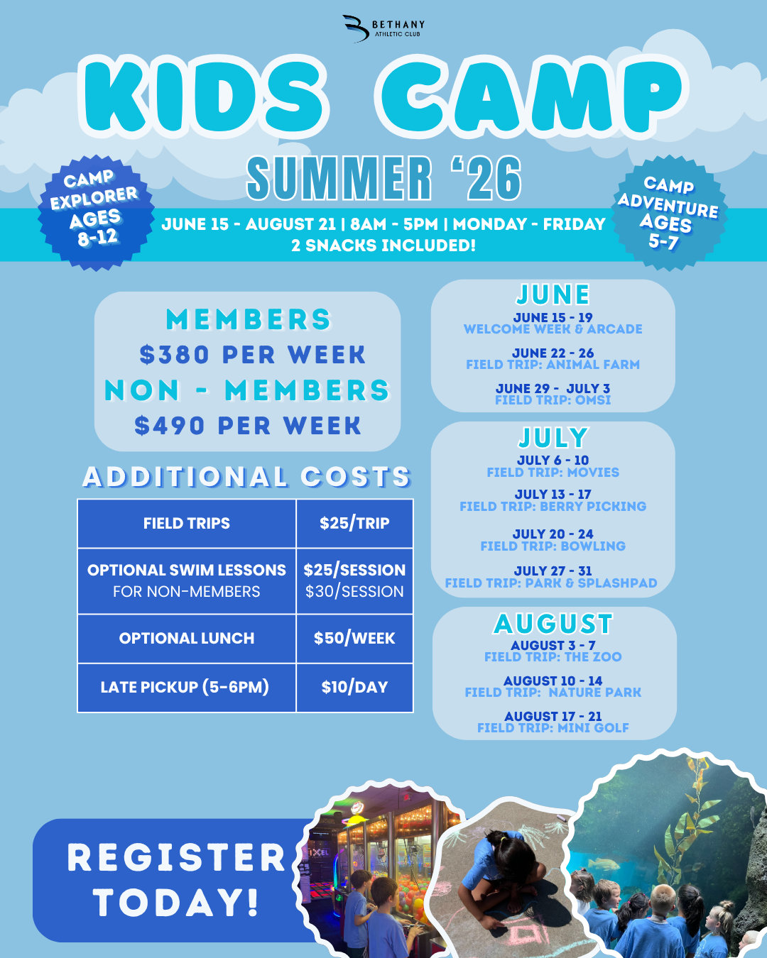 In the heart of Bethany Village, Bethany Athletic Club provides an exciting summer camp for families in the Portland area, with optional add-ons including field trips and swim lessons. Spots fill quickly, so register early to secure your child’s place for a summer full of fun, activity, and new friendships. Contact us for more details!