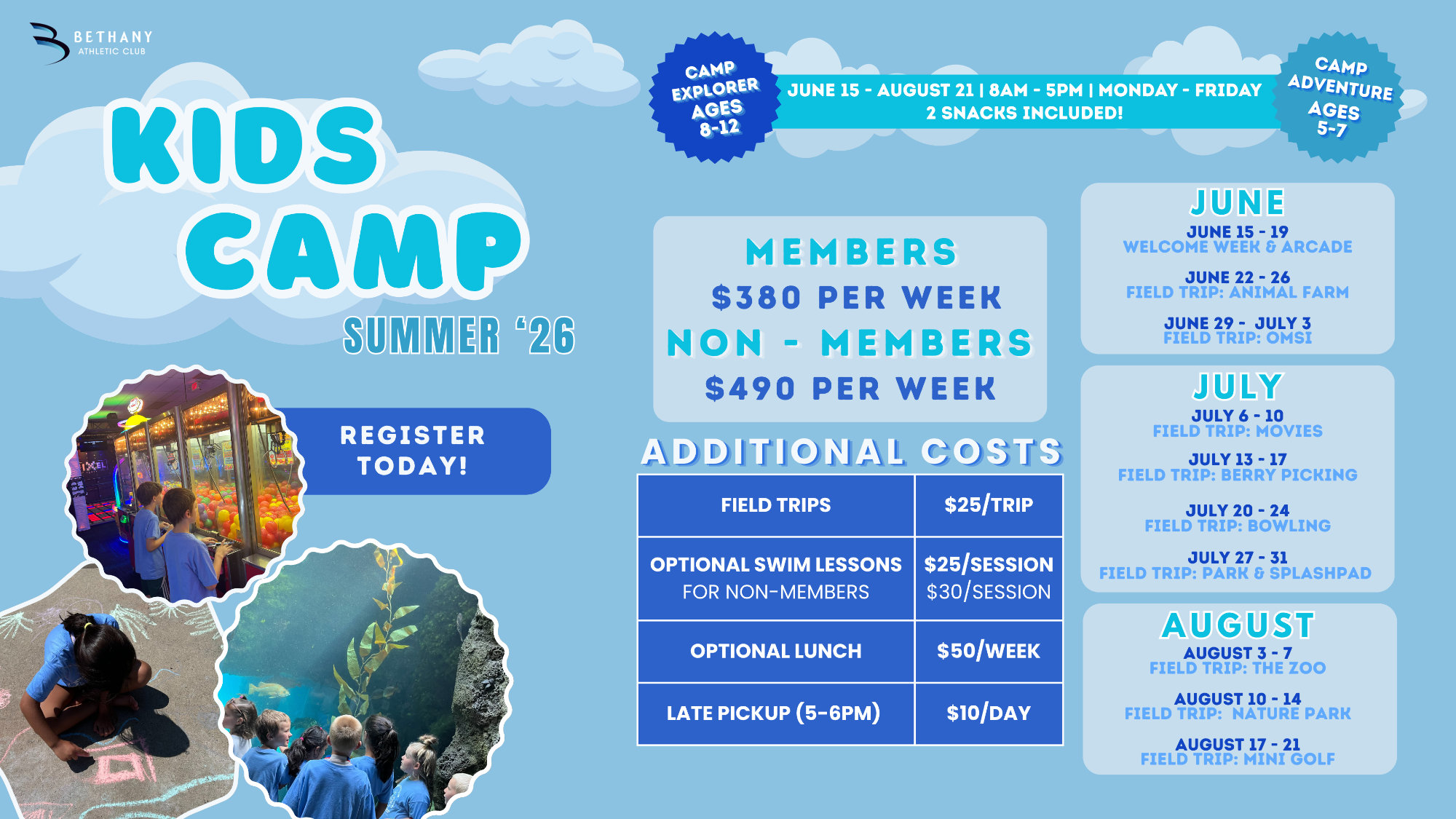 Bethany Athletic Club Summer Camp welcomes children ages 5–12 and is organized into two age groups: Camp Adventure (ages 5–7) and Camp Explore (ages 8–12).